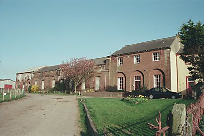 “Formerly a late C18 mansion, now reduced to provide a farmhouse and buildings. Only intact portion is present farmhouse to the right, of 2 storeys in red sandstone ashlar with slated roof. 3 windows above triple-arcaded ground floor with 2 windows with later hung sashes with glazing bars and centre door of 6 fielded panels with 3-light rectangular fanlight.” (Historic England)