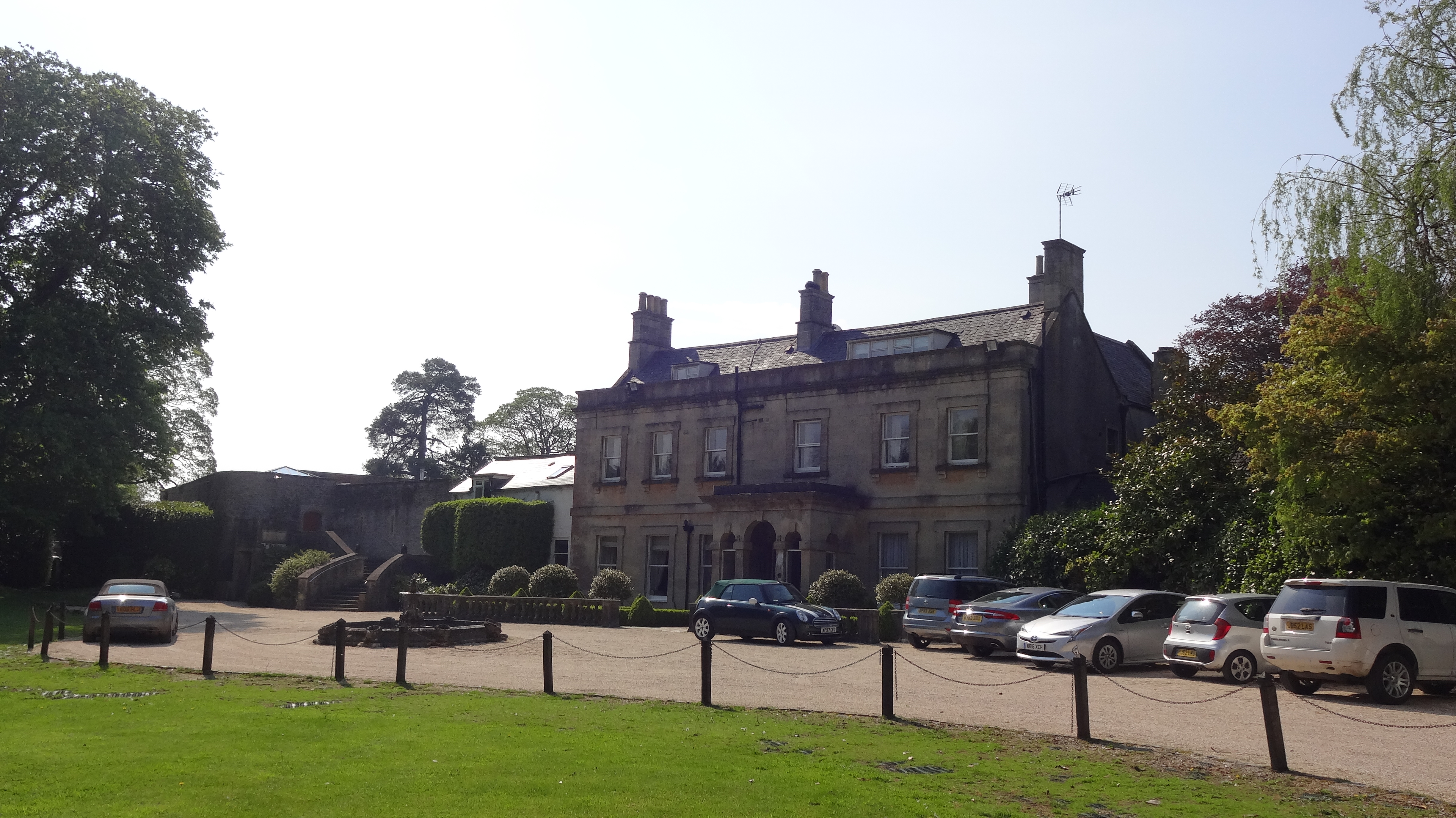 Country house in landscaped grounds. Circa 1810. Doulting ashlar, hipped slate roof with dormers, 3-ashlar stacks, moulded around base and apex. “L”-shaped on plan, 2-storeys and attic. (Historic England)