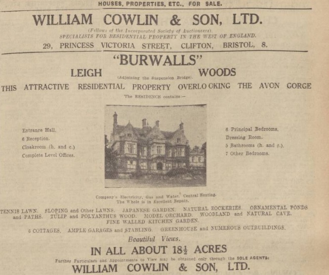 Burwalls was offered for sale but eventually let as an unfurnished property. It was requisitioned by the War Office at the outbreak of World War Two, the house adapted to become the headquarters of the Heavy Anti-Aircraft Regiment who found it ideally situated to protect Bristol and its port. Towards the end of the war it became an army educational centre.