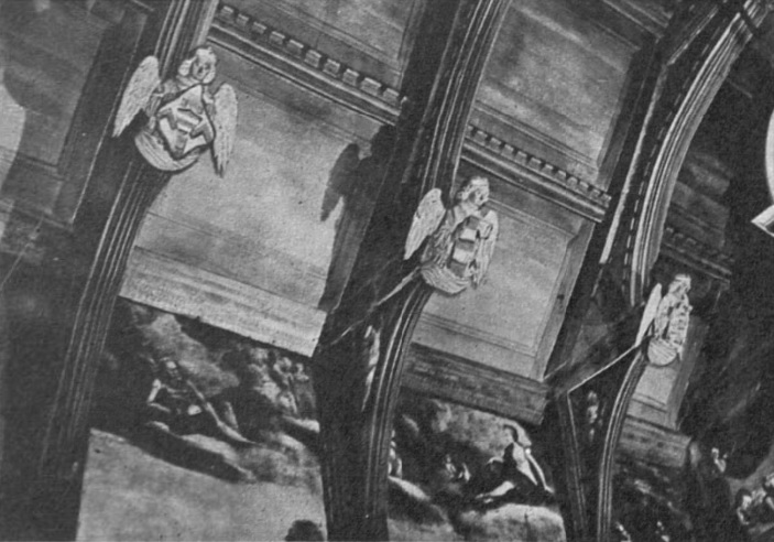 April 1950. An example of elaborate decoration on the Great Hall at Adlington. Demi-angels bearing shields are placed at the terminals of the beams in the large hammer-beam roof. Image: The British Newspaper Archive.